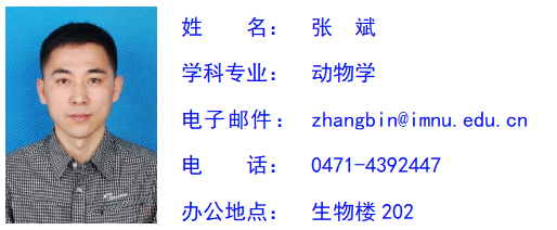 张斌,男,汉族,生于1979年,祖籍辽宁康平,理学博士,教授,博士生导师。村花论坛 副院长,内蒙古自治区动物学会副理事长,内蒙古自治区“草原英才”。先后入选内蒙古自治区“青年创新人才”一层次、内蒙古高等学校“科技领军人才”。研究领域包括动物系统进化、干旱区环境与动物演化、有害生物防控、媒介生物学与病原控制等。主持国家重点研发计划课题1项、国家科技部基础资源调查专项课题共1项、国家自然科学基金项目3项、省部级科研项目10余项。发表研究论文70余篇,SCI收录40篇,出版学术著作4部。