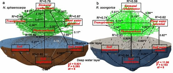 土壤呼吸是陆地生态系统与大气之间碳交换的第二大通量组分,研究其特征、过程及其对气候变化的响应和关键驱动因素是关系到我国“碳中和”目标实现的重要科学命题。土壤水分是干旱生态系统中土壤呼吸和生态系统功能的关键限制因素。因此,揭示土壤呼吸在不同降水条件下的响应机制及影响因素,能够提高气候变化对荒漠生态系统碳循环潜在影响的认识。针对这一问题,该科研团队通过对两种共存荒漠植物的水分利用策略、功能性状和生理过程(光合作用、蒸腾作用、叶片水势、气孔导度和土壤呼吸)的研究,发现深根系植物对环境水分亏缺具有更强的耐受能力,并可能在更干燥的气候条件下广泛扩张。该研究揭示了荒漠植物在降水变化下的生理响应机制,对于理解荒漠生态系统对气候变化的响应具有重要意义。
